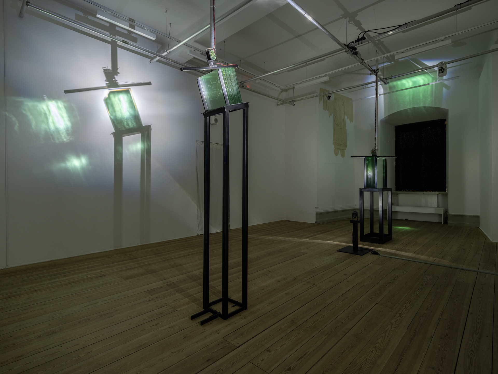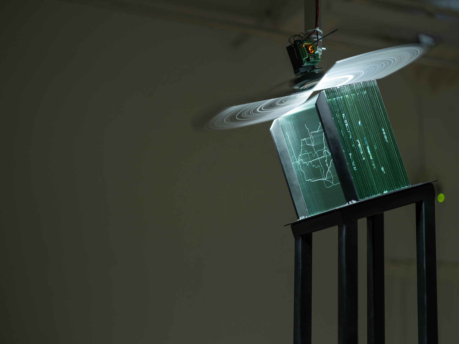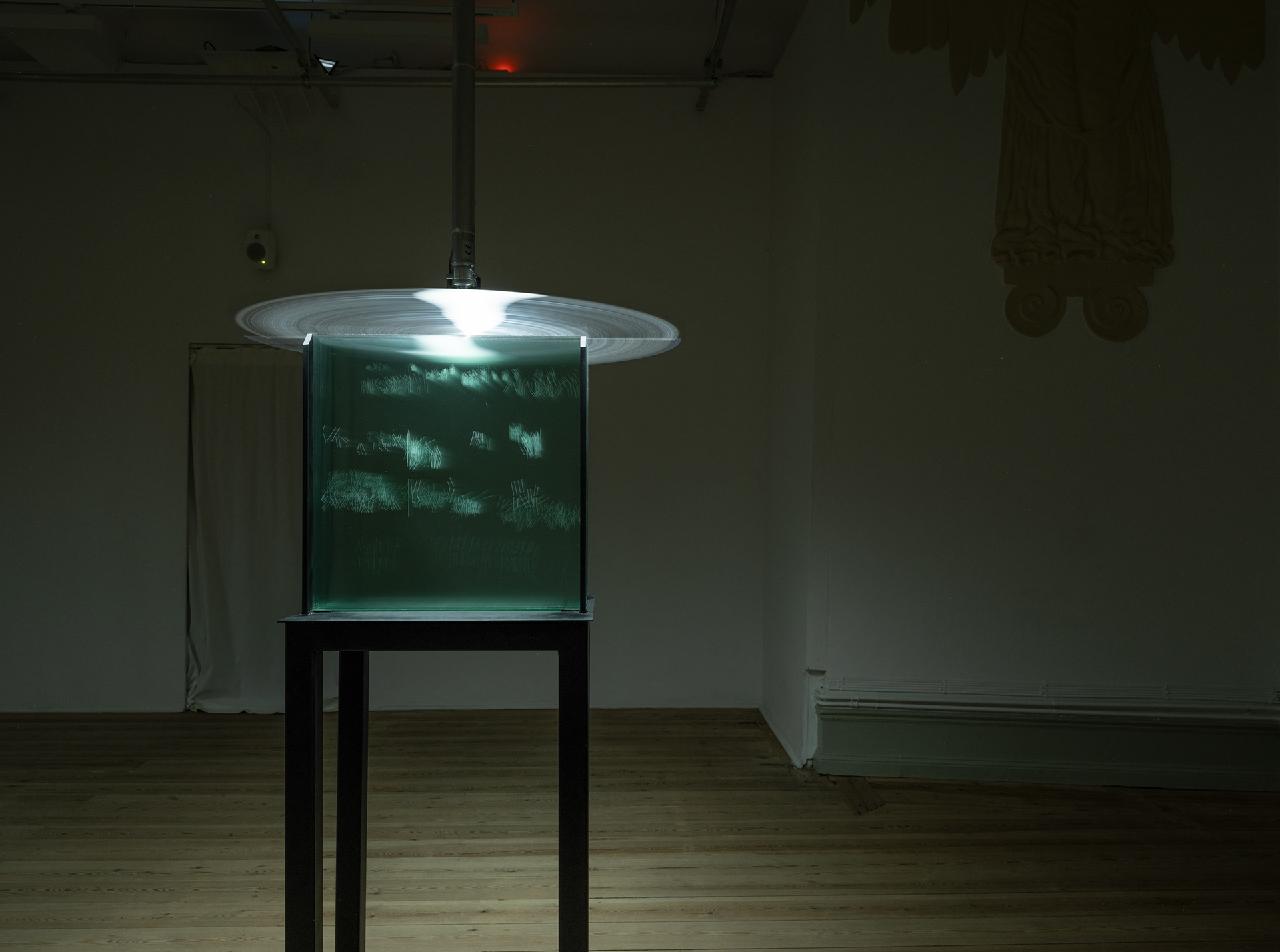 After Home is a spatial installation, where sound, light and sculptural elements interact. For this exhibition, Nicole Khadivi created two kinetic sculptures and a multi-channel sound work in collaboration with Marius Varhaugvik. The rotating sculptures consist of glass sheets with etchings stylised drawings that slowly embrace the room with shadows and reflected light.