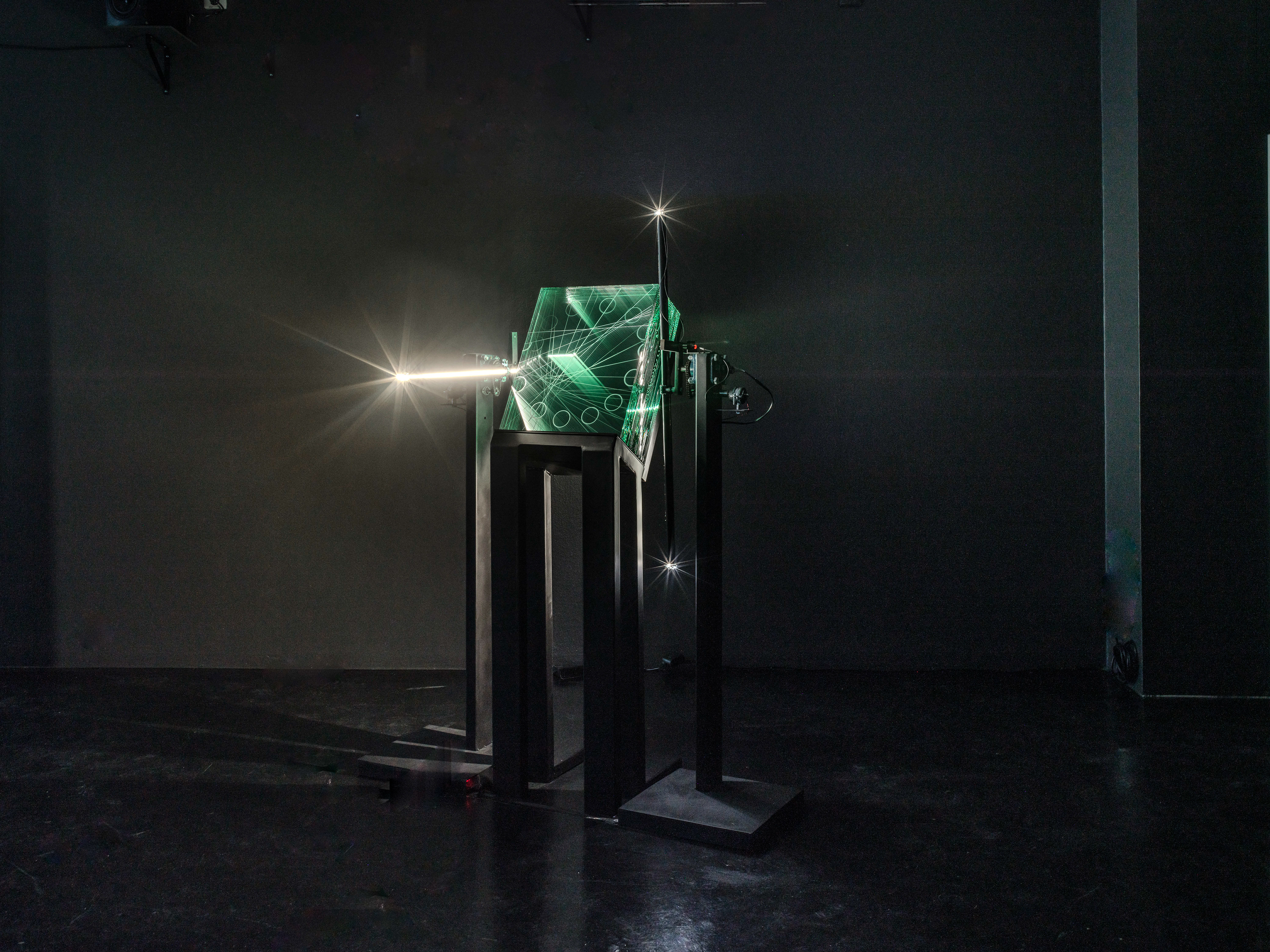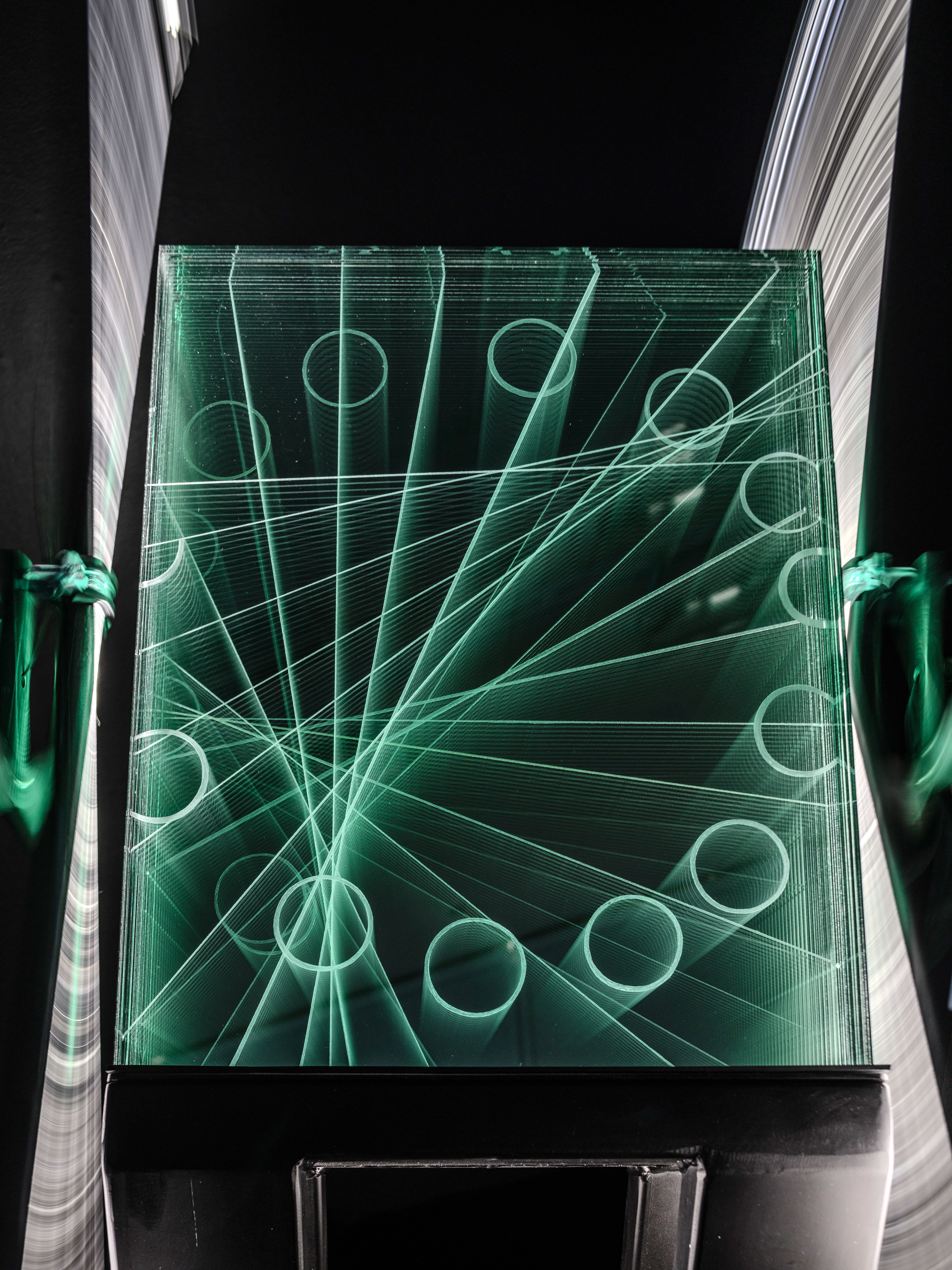 In Seen From Somewhere, the glass engravings are inspired by a NASA film clip showing a rotating horizon where the sun disappears behind the edge and then reappears. As the sculpture’s light source rotates, the engravings are illuminated, creating a real-time animation. Khadivi has engraved the motion into the glass so that the circle remains visible through each transparent layer, never disappearing behind a horizon – a manifested fantasy of a perception beyond that of the camera and the human eye. Khadivi abstracted the motif to approach the geometric and numerical components that form digital images.