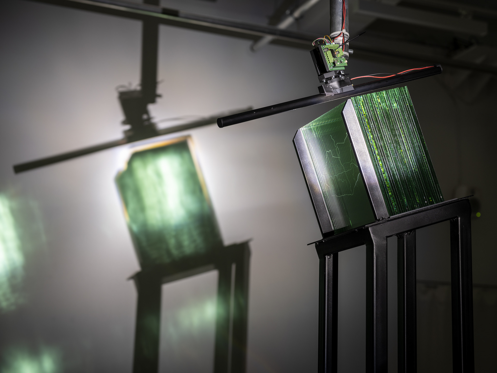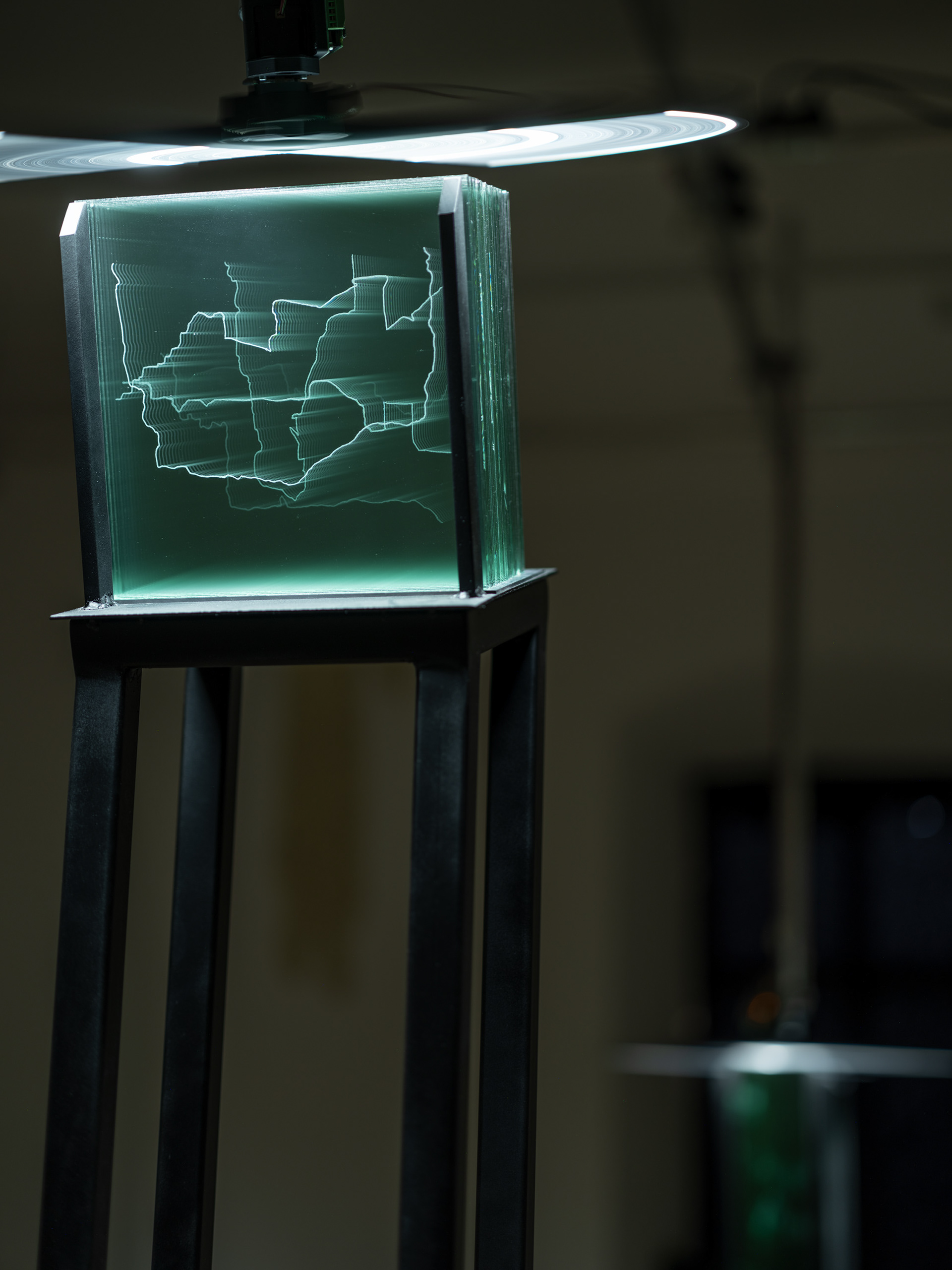 The sculpture consists of 29 glass panels, each engraved with horizons of ruins from an abandoned town in Sicily – an echo of the silence left by an earthquake. Through the transparent layers, a stratified landscape emerges, where light moves between the remnants of what once was. Above, a light source rotates like a helicopter propeller, inspired by the sensation of flying over a place or drifting through memories. The work captures a moment suspended between decay and stillness, where the contours of memory slowly dissolve into the glass.